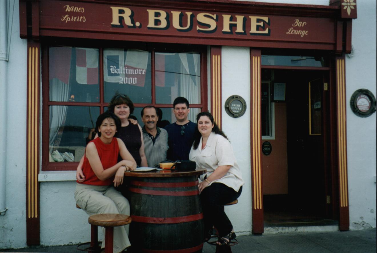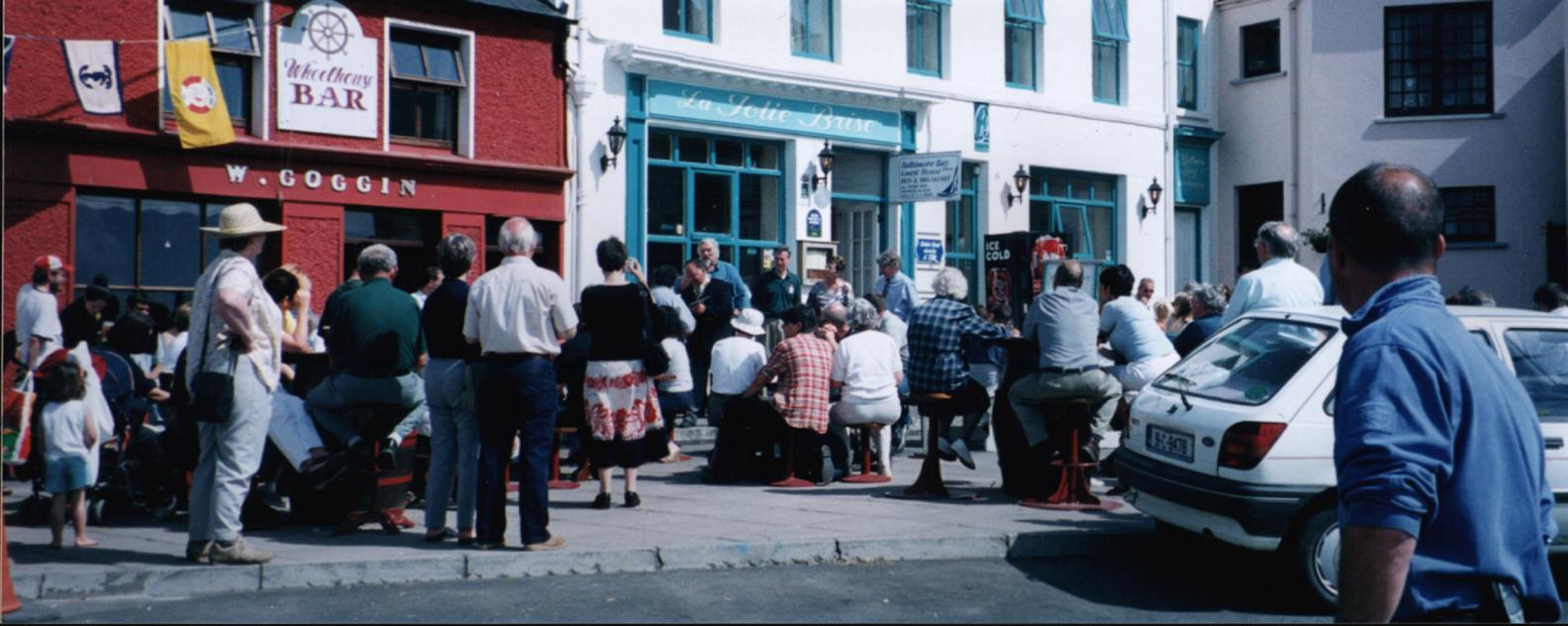 Since the Clan Gathering's inception, many Clan members have braved the trip from other parts of the world to visit the birthplace of their forefathers and to take in the wonderful Irish hospitality offered there. The festivities centre around the town square and Bushe's Bar located there. The proprietess of the bar, Eileen O'Driscoll Bushe, is a sister to one of our former Clan Chieftains, Bernard O'Driscoll. As one of our entourage noted, in this town you can't "swing a dead cat" without hitting an O'Driscoll Clan member. |